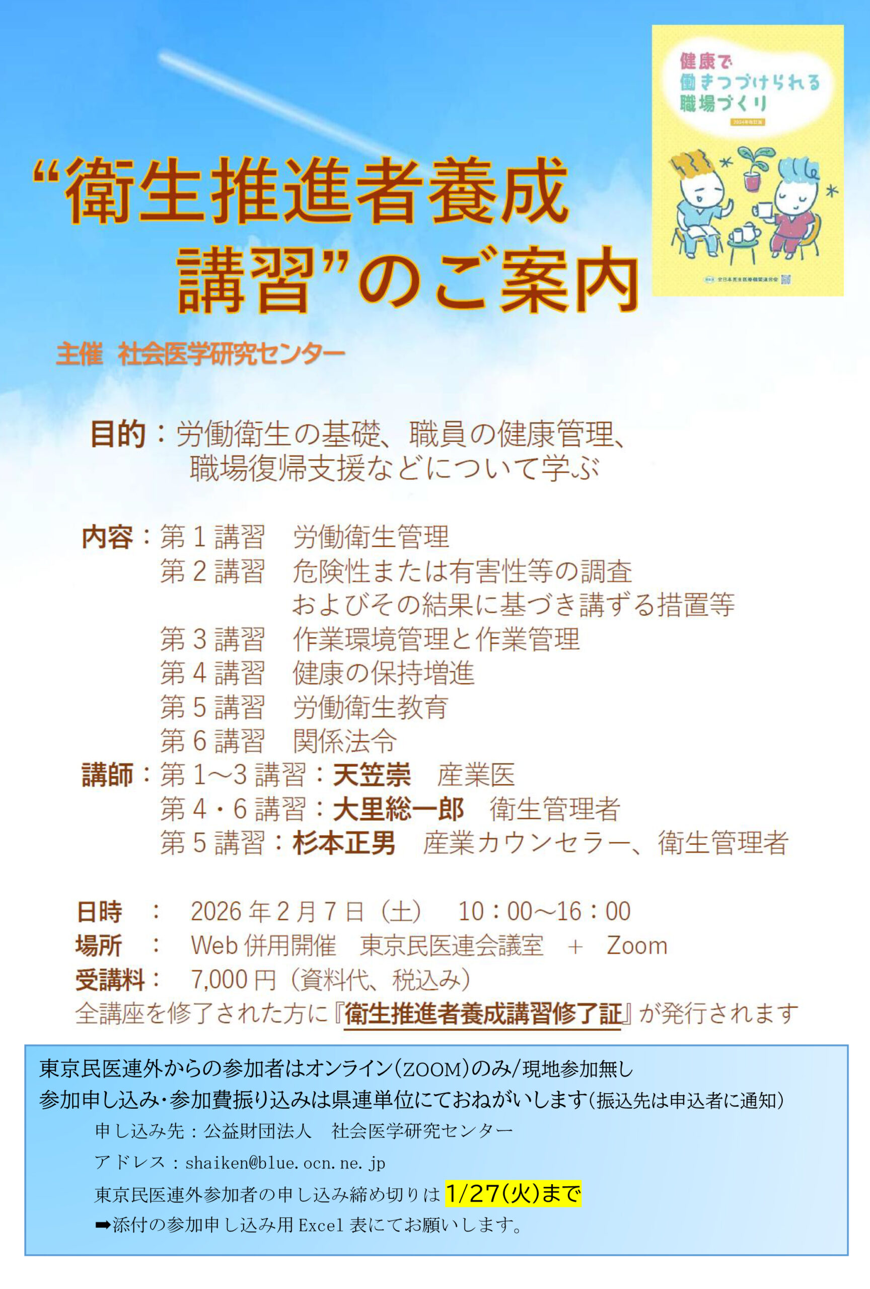 労働衛生の基礎、職員の健康管理、職場復帰支援などについて学ぶことを目的にして、公益財団法人 社会医学研究センター主催で“衛生推進者養成講習”が2月7日(土)に開講されます。